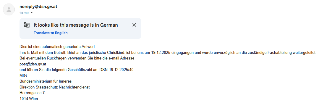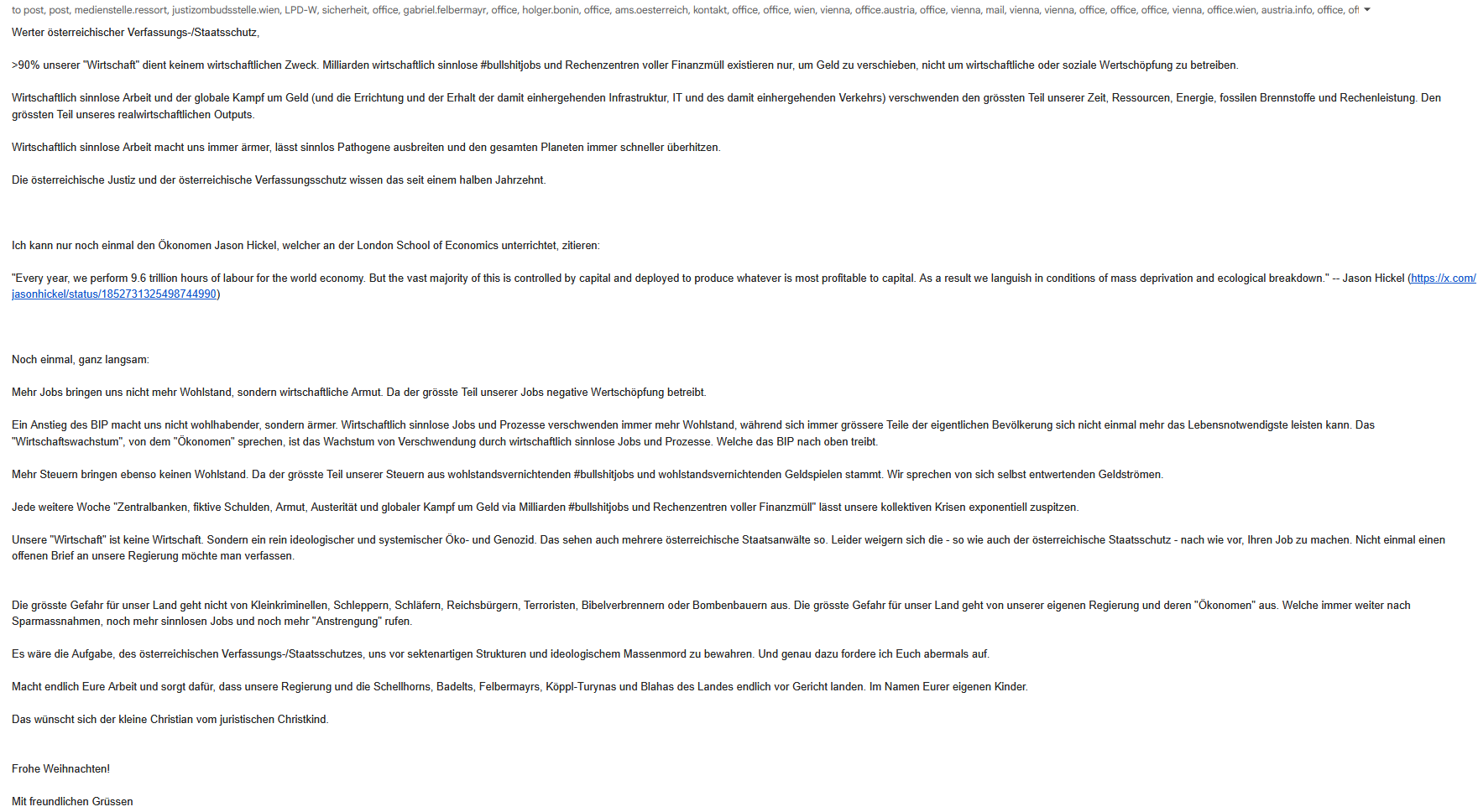 The Austrian intelligence agency inviting me to an interrogation regarding messages to the management of our public broadcaster and several politicians. Telling them that they will end up with life sentence for allowing COVID19 to spread via the same bullshit jobs that also cause climate collapse and inflation. While completely ignoring the actual issue. |