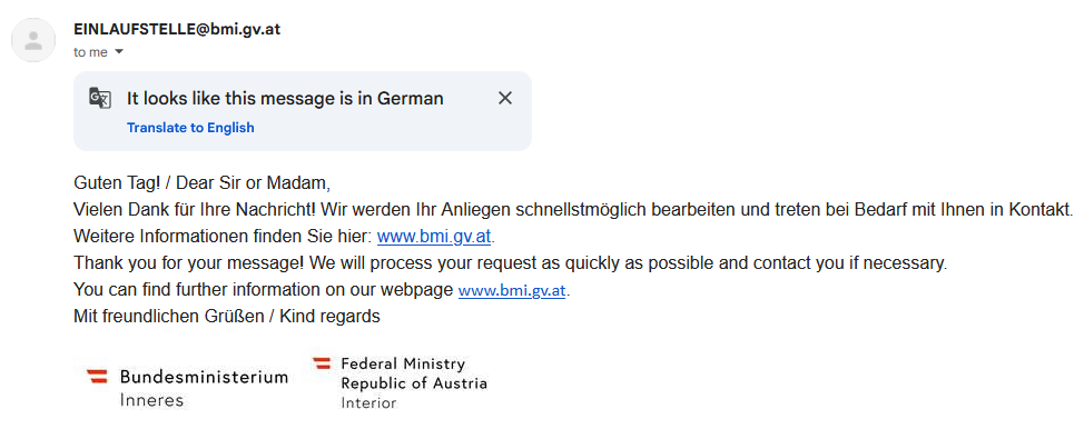 Officer Corinna Gneist confirming that I will receive a compensation for my unlawfully confiscated handgun and rifle. A compensation I never asked for; of Eur 3,605. A fraction of what I actually paid. All items were unused and like new. Officer Corinna Gneist also asking me to pay Euro 14,30. To compensate the Austrian police / intelligence agency for unlawfully revoking my weapons permit and confiscating my legally owned handgun and rifle. While completely ignoring the actual issue. |
